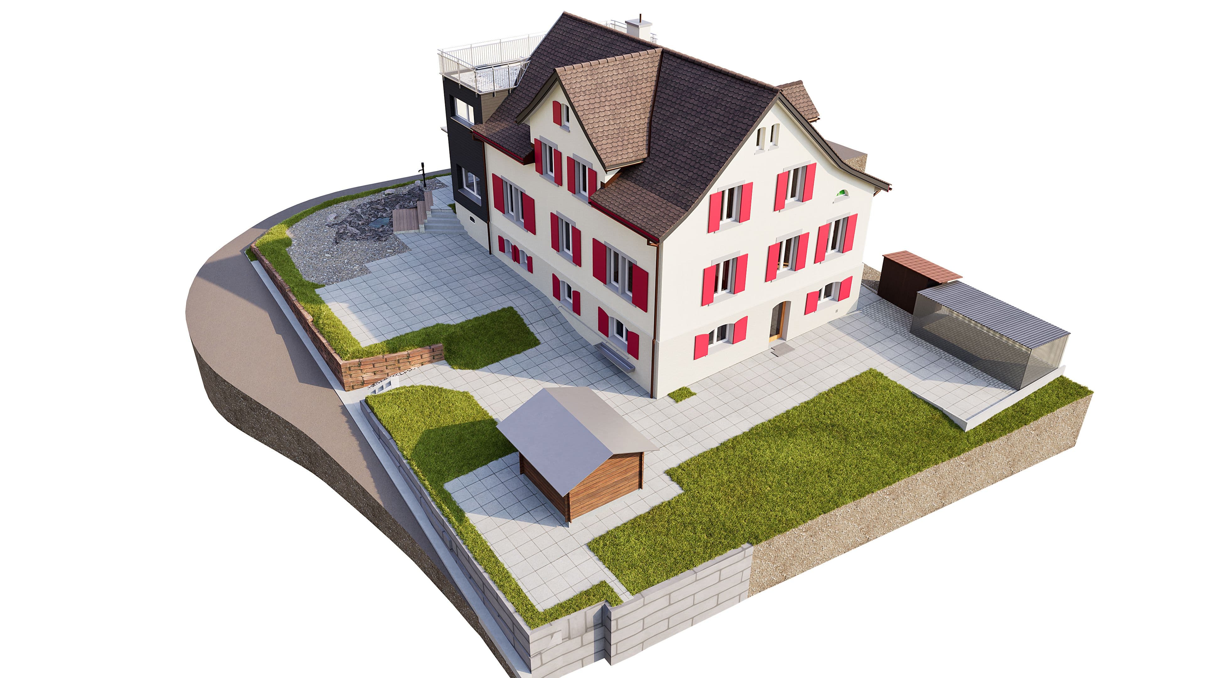 The entire property was surveyed as part of the building survey. A particular focus was placed on the transitions between the old and new buildings as well as the different roof and façade geometries. A precise 3D CAD model was created from laser data on the basis of the laser scan data, which realistically depicts the geometry and spatial relationships of the building.