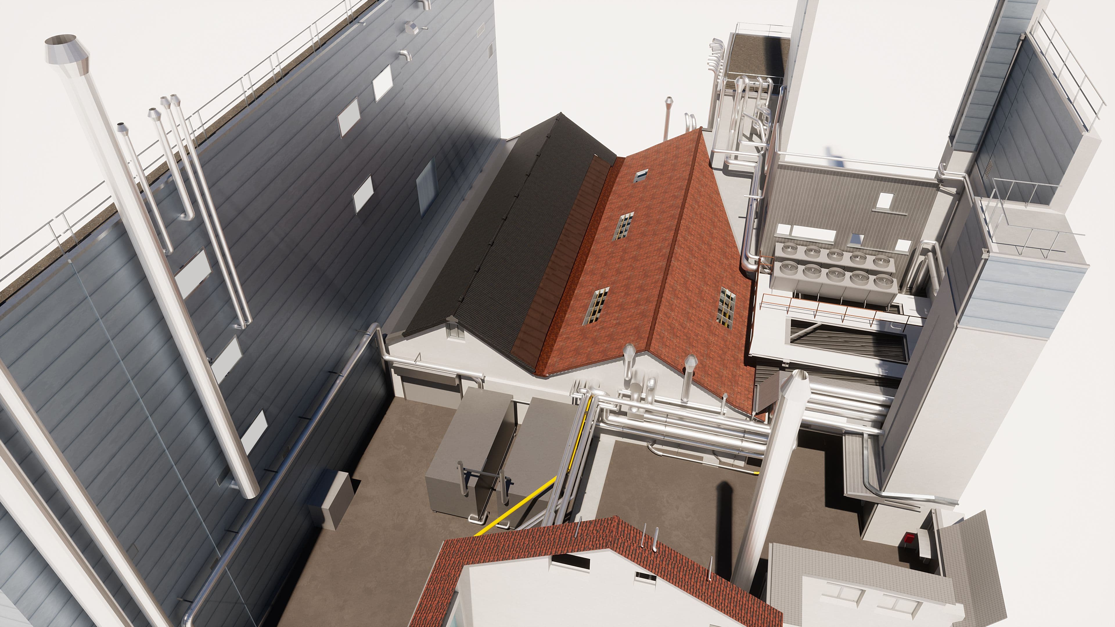 Das Ergebnis liefert genau angaben zur Architektur der beiden Gebäude, zur Umgebung rund um diese sowie alle Leitungen und Maschinen im und um die Gebäude.